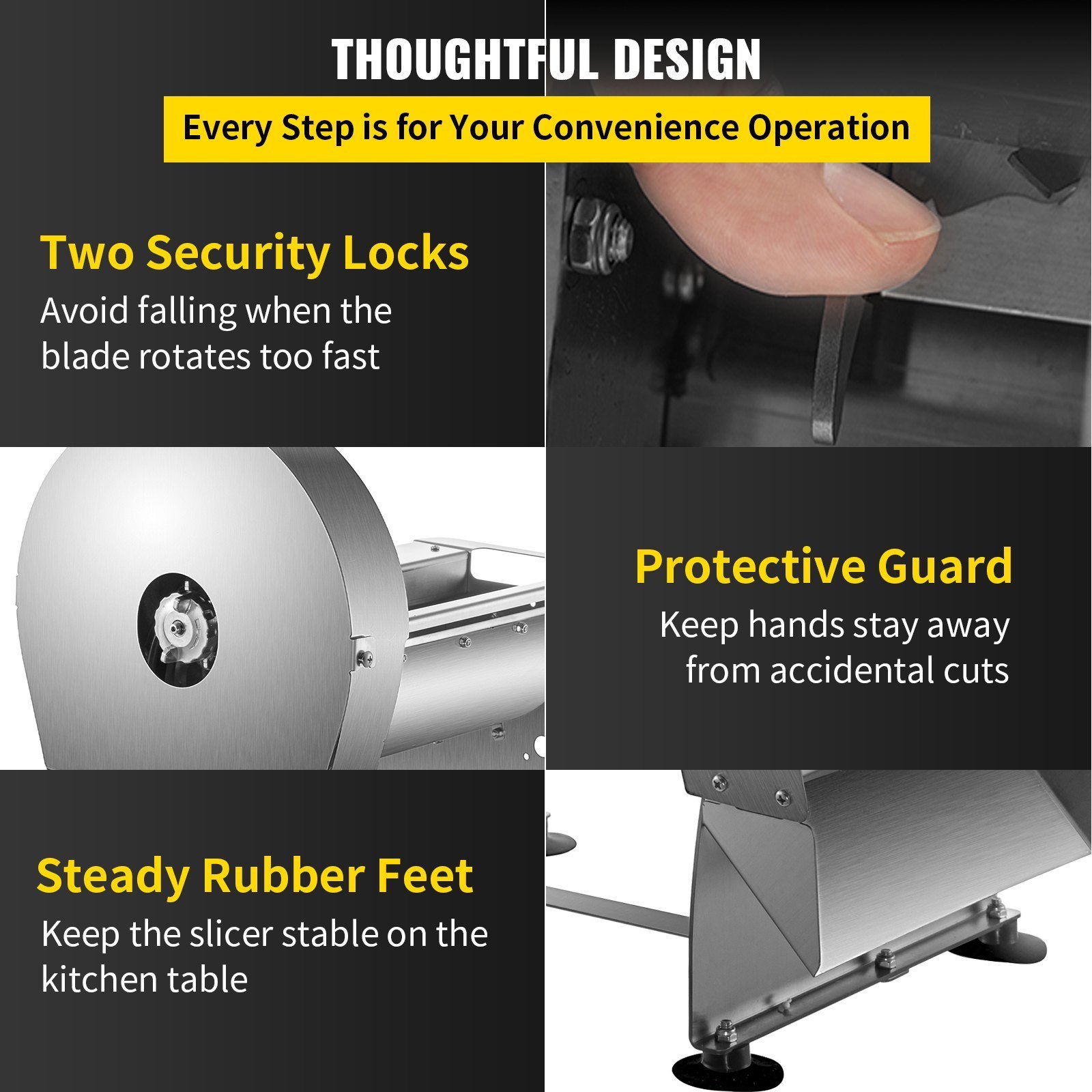 Blade guards and lockable design keep you security from the danger of sharp blades when using the commercial potato slicer. 4 non-slip feet keep the machine stable while working.